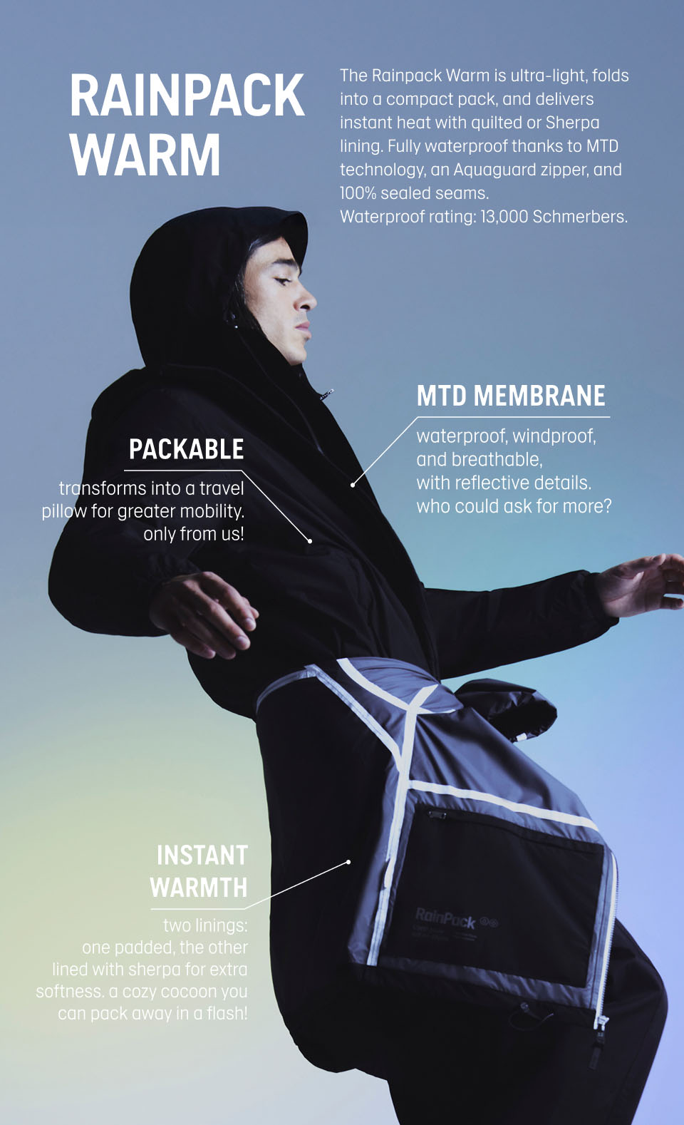 RAINPACK WARM SHERPA 90+ : Sherpa-lined windproof MTD Raincoat, Long & Foldable - No Gender